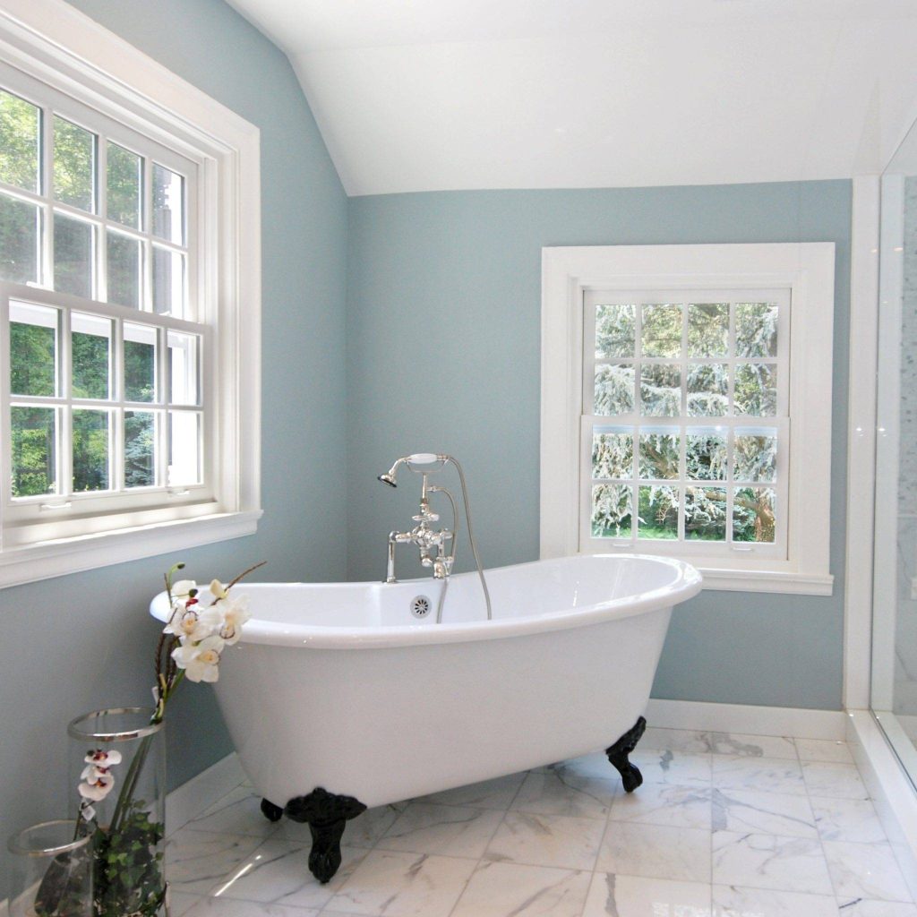 Phòng tắm là nơi mang đến sự thư giãn tối đa sau một ngày dài. Do đó, lựa chọn màu sắc nên hỗ trợ sự yên tĩnh và tạo ra bầu không khí thư thái. Màu xanh lam được biết đến với khả năng làm giảm nhịp tim và huyết áp, vì vậy đây là một lựa chọn tuyệt vời cho phòng tắm. Màu xanh Yarmouth của Benjamin Moore là một tông màu sáng tuyệt đẹp, giúp không gian mở rộng và thoáng đãng hơn. Màu xanh lam nhạt tạo thêm nét tươi mát, đặc biệt nổi bật trên nền đá cẩm thạch. Kết quả là một phòng tắm sang trọng, mang đến cảm giác như đang ở spa.