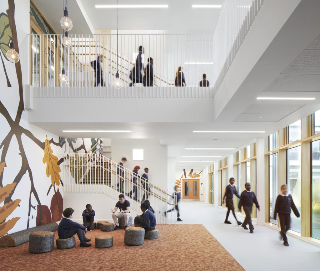 Tương tự, tại nơi làm việc và giáo dục, ô nhiễm tiếng ồn có thể ảnh hưởng tiêu cực đến sức khỏe tinh thần, khả năng tập trung và thể chất. Các nguồn gây tiếng ồn bao gồm tiếng giao thông và máy bay, tiếng nhạc lớn, tiếng trò chuyện trong không gian mở, hoặc tiếng ồn từ các tòa nhà lân cận. Thiết kế cung cấp các giải pháp mạnh mẽ để giảm thiểu nhiễu âm thanh. Lựa chọn thiết kế kiến trúc và nội thất chu đáo có thể giảm đáng kể tiếng ồn, tạo ra môi trường thoải mái và hiệu quả hơn. Tại các cơ sở giáo dục, âm học nội bộ tốt cũng giúp tăng cường khả năng nghe rõ của giảng viên.