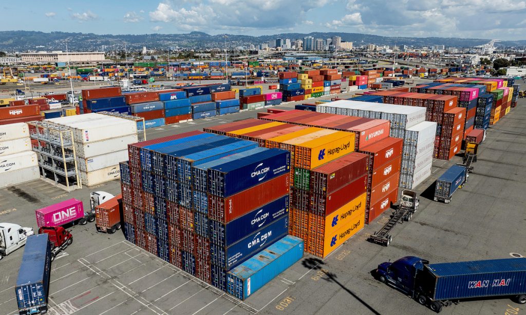 Container hàng hóa tại cảng Oakland, bang California, Mỹ ngày 3/4. Ảnh: AP
