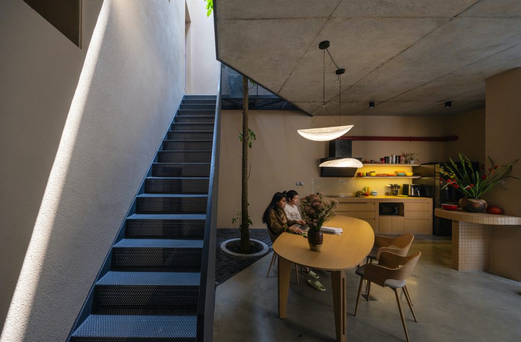 Không gian kiến trúc được chế tác tỉ mỉ để ánh sáng tự nhiên có thể thấm sâu. Hơn nữa, những tia nắng ban ngày len lỏi qua các cấu trúc mở, nhẹ nhàng vuốt ve bề mặt vật liệu độc đáo trước khi đọng lại ở những góc khuất, như thể mỗi không gian trong ngôi nhà đều kể câu chuyện riêng của nó.