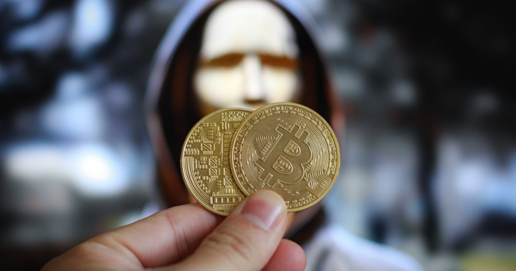 Đồng xu biểu tượng Bitcoin trước tượng Satoshi Nakamoto