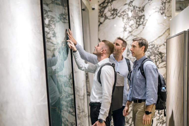 Các kiến trúc sư trải nghiệm và lựa chọn các bảng material palette tại showroom DIVO Ceramica.