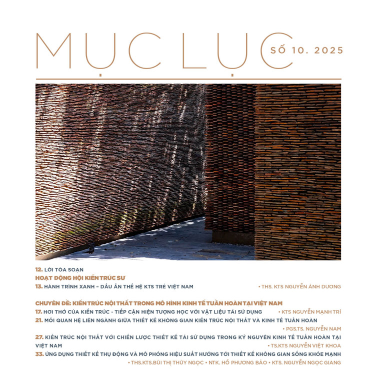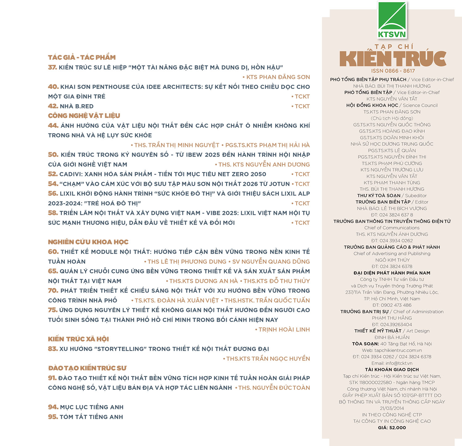 Bên cạnh những bài nghiên cứu, điểm nhấn của Tạp chí số 10/2025 chính là những hoạt động tiêu biểu của giới nghề như: Liên hoan KTS trẻ toàn quốc, hành trình xanh trong nghiên cứu và hành nghề, Triển lãm Nội thất và xây dựng Việt Nam – Vibe 2025 …