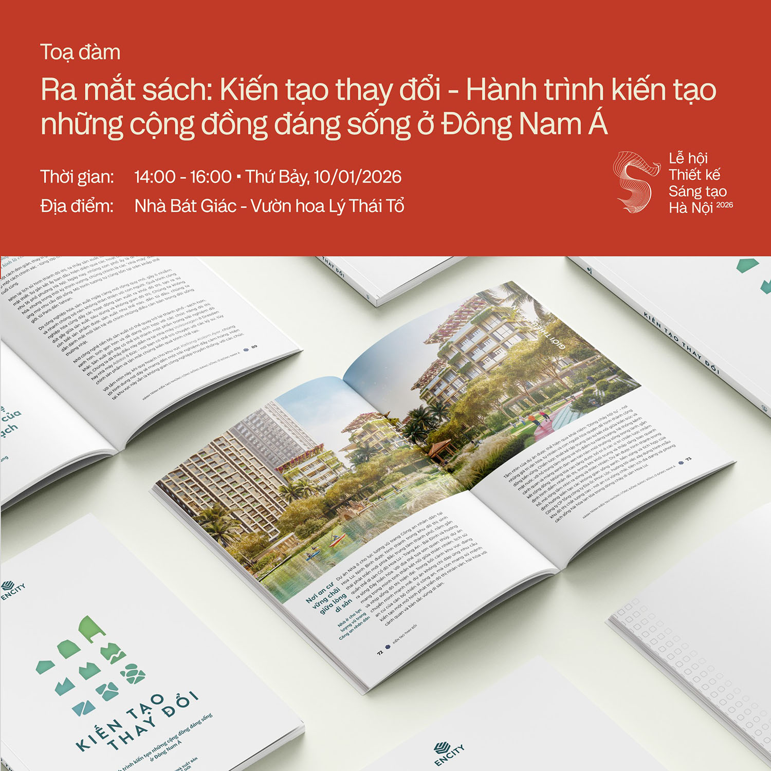 Nằm trong khuôn khổ Lễ hội Thiết kế Sáng tạo Hà Nội 2026, chiều ngày 10/01/2026, tại Nhà Bát Giác – Không gian Vườn hoa Lý Thái Tổ, Hà Nội sẽ diễn ra Toạ đàm ra mắt ấn phẩm: “Kiến tạo thay đổi – Hành trình kiến tạo những cộng đồng đáng sống ở Đông Nam Á”. Sự kiện do Tạp chí Kiến Trúc (TCKT), enCity, NXB Omega Plus phối hợp cùng Hội nghề nghiệp bảo trợ về chuyên môn mà enCity là một Chi hội thành viên: Hội Kiến trúc sư Việt Nam.