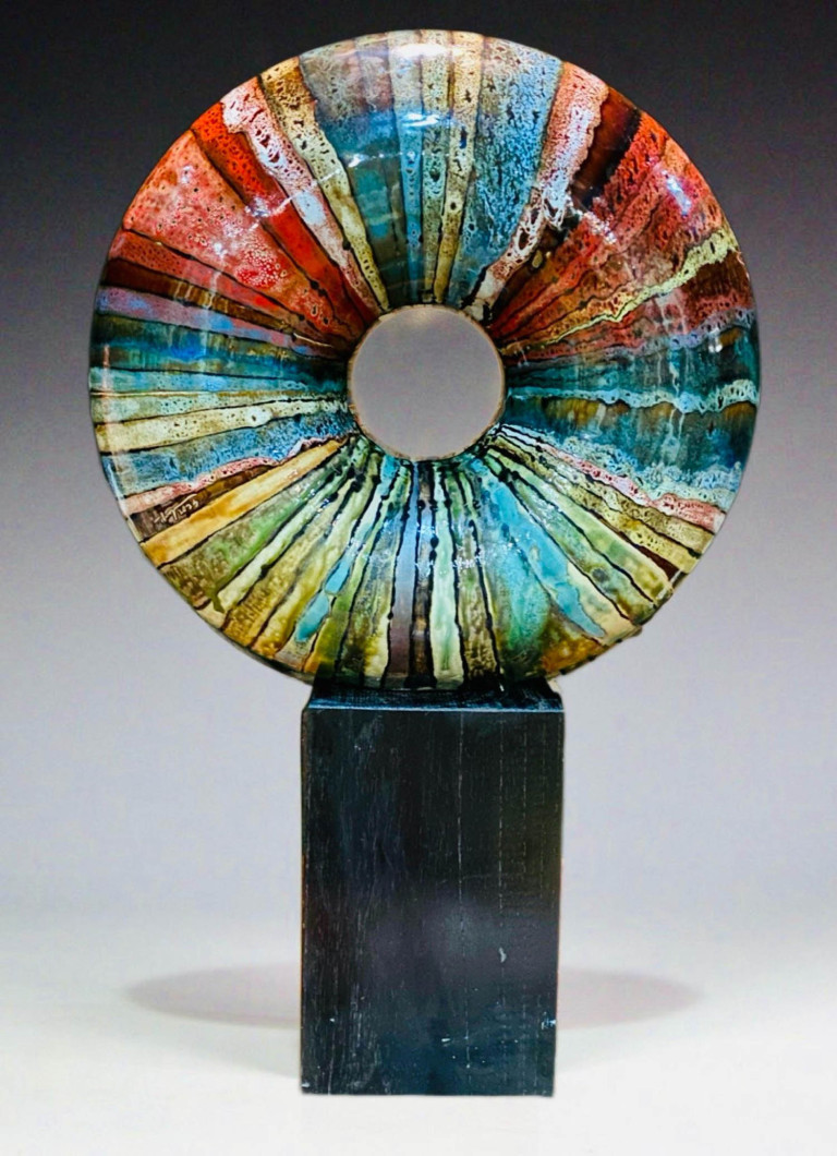 Về bộ “Luân hồi”: “Samsara gợi lên hình ảnh vòng luân hồi, vừa là sự tuần hoàn của tự nhiên, vừa là chu trình tái sinh của chính vật liệu. Mỗi khối tròn khép kín như một cổng thời gian: có khối phủ men xanh rêu, kết cấu vảy xếp lớp như vỏ sinh vật cổ; có khối men lam mịn màng, ám chỉ sự mong manh và giới hạn đời sống… Ở Samsara, vốn được lấy cảm hứng từ loại hình donut vase (bình hình bánh donut) – một dạng thức khá phổ biến trong gốm nghệ thuật thế giới nhưng thường chỉ được làm ở kích thước nhỏ để ứng dụng trong đời sống như bình hoa, ấm trà, chân nến…. chị dường như không còn quan tâm đến công năng hay hình thức trang trí thuần túy: gốm trở thành biểu tượng thiền định, nơi đất sét và lửa kể câu chuyện về sự hủy diệt và hồi sinh bất tận. Nghệ sĩ Nguyễn Thu Thủy cũng đã nghiên cứu và phát triển kỹ thuật vuốt tay hai lòng (double-walled hand-building), sau đó hướng dẫn cho các thợ vuốt gốm tại Bát Tràng thực hiện. Nhờ việc trộn đất samot vào đất vuốt Bát Tràng và tạo các thanh đỡ trong lòng, chị và những người thợ lành nghề của Bát Tràng đã tạo ra những tác phẩm khối tròn với đường kính hơn 60cm – một thành tựu đáng kể về mặt kỹ thuật, đòi hỏi sự tính toán chính xác về độ co ngót của đất, độ dày thành và quy trình nung để tránh nứt vỡ.