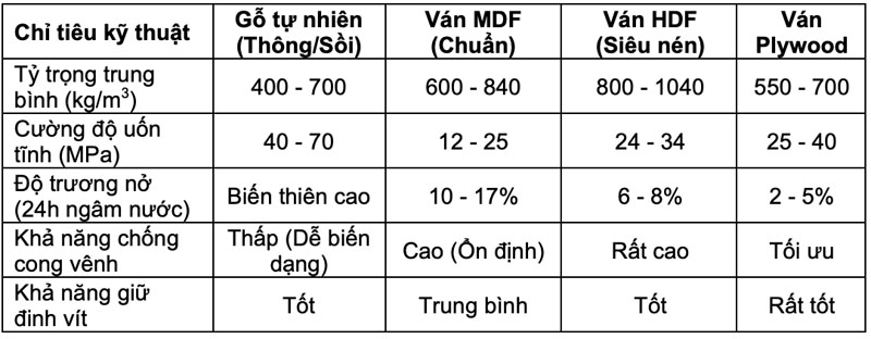 Sự ưu việt của gỗ công nghiệp được minh chứng rõ nét qua các chỉ số kỹ thuật ổn định, không phụ thuộc vào các khiếm khuyết tự nhiên như mắt gỗ hay thớ xoắn.