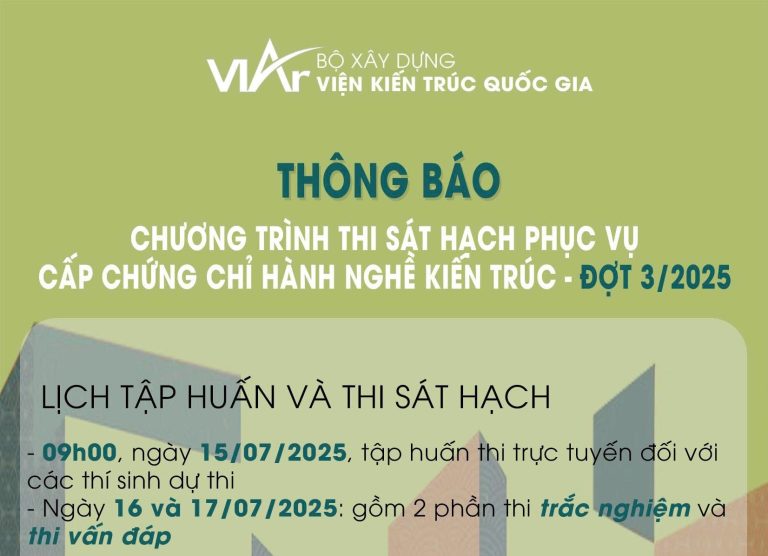 Nhằm giúp các Kiến trúc sư cấp chứng chỉ hành nghề, Viện Kiến trúc Quốc gia thông báo tổ chức kỳ thi sát hạch phục vụ cấp chứng chỉ hành nghề Kiến trúc với nội dung thông tin dưới đây:
